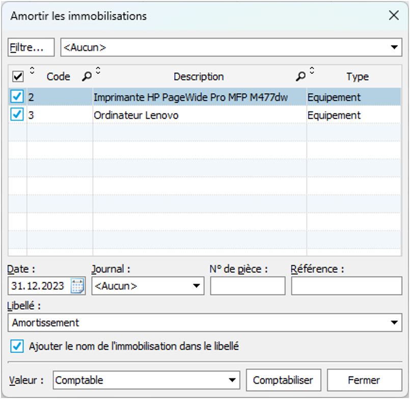 2. Entrez la date des écritures d’amortissements, le journal, éventuellement le no de pièce et la référence.