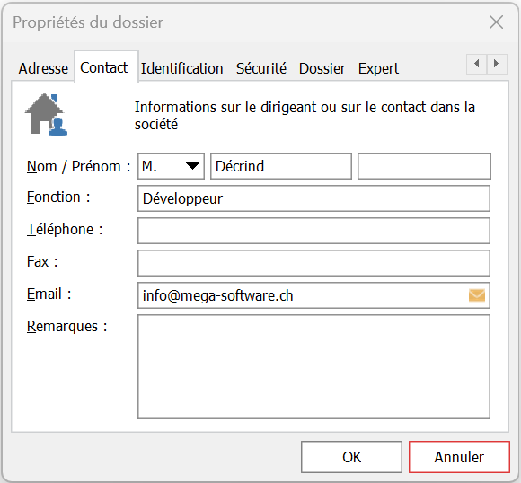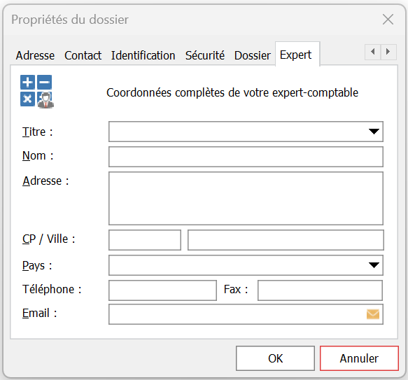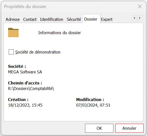 Remarque: Dans l'onglet Dossier figurent les informations du Dossier (chemin d'accès, Création et Modification). Dans l'onglet Expert vous pouvez y inscrire les coordonnées de votre Fiduciaire.