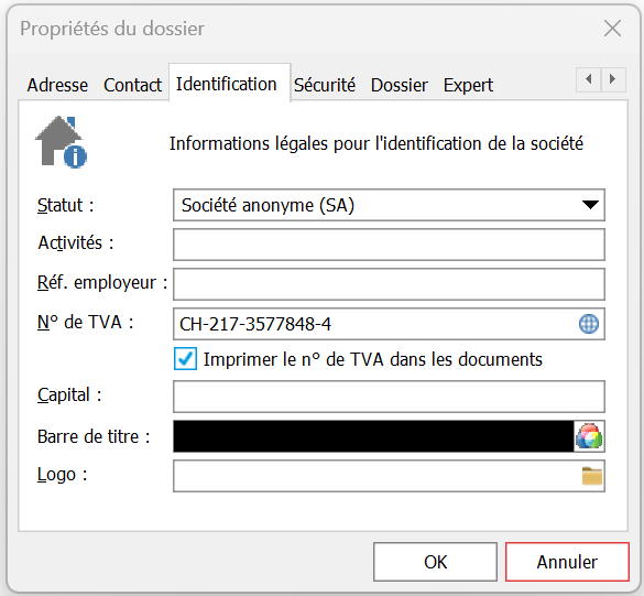 Remarque: Si vous souhaitez que le numéro de TVA s'imprime dans les documents de vente, il faut se rendre dans l'onglet Identification et cocher la case Imprimer le n° de TVA dans les documents.