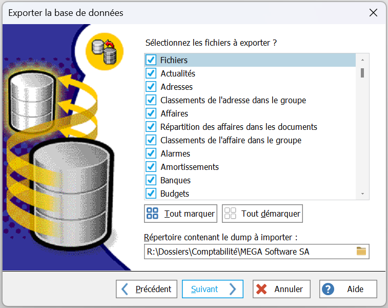 Remarque : Cet assistant peut également être utilisé pour effectuer une sauvegarde. Vous devez sélectionner tous les fichiers pour que votre sauvegarde contiennent la totalité des données.