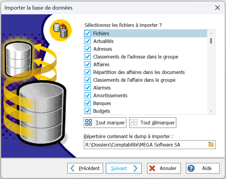 2. L'assistant d'importation de la base de données s'ouvre. Vous pouvez :