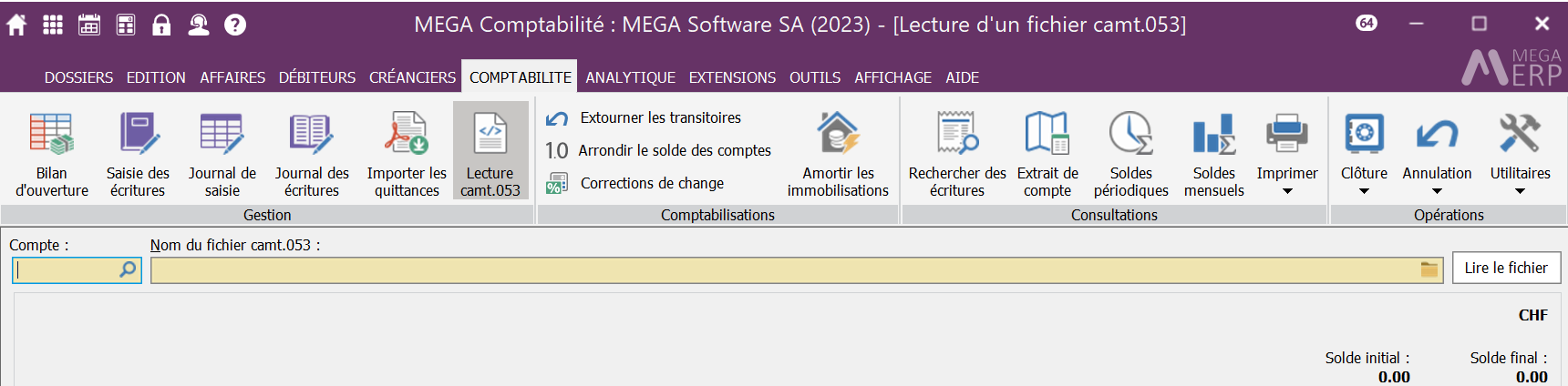 Avant de lire une CAMT053, il faut impérativement avoir lu tous les CAMT054 dans le module MEGA Gestion Intégrée et avoir effectué l’imputation comptable.