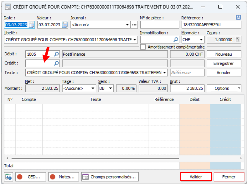 En effectuant un double clic sur une écriture avec fond blanc, vous pouvez définir quel compte cette écriture va impacter (voir ci-dessus).