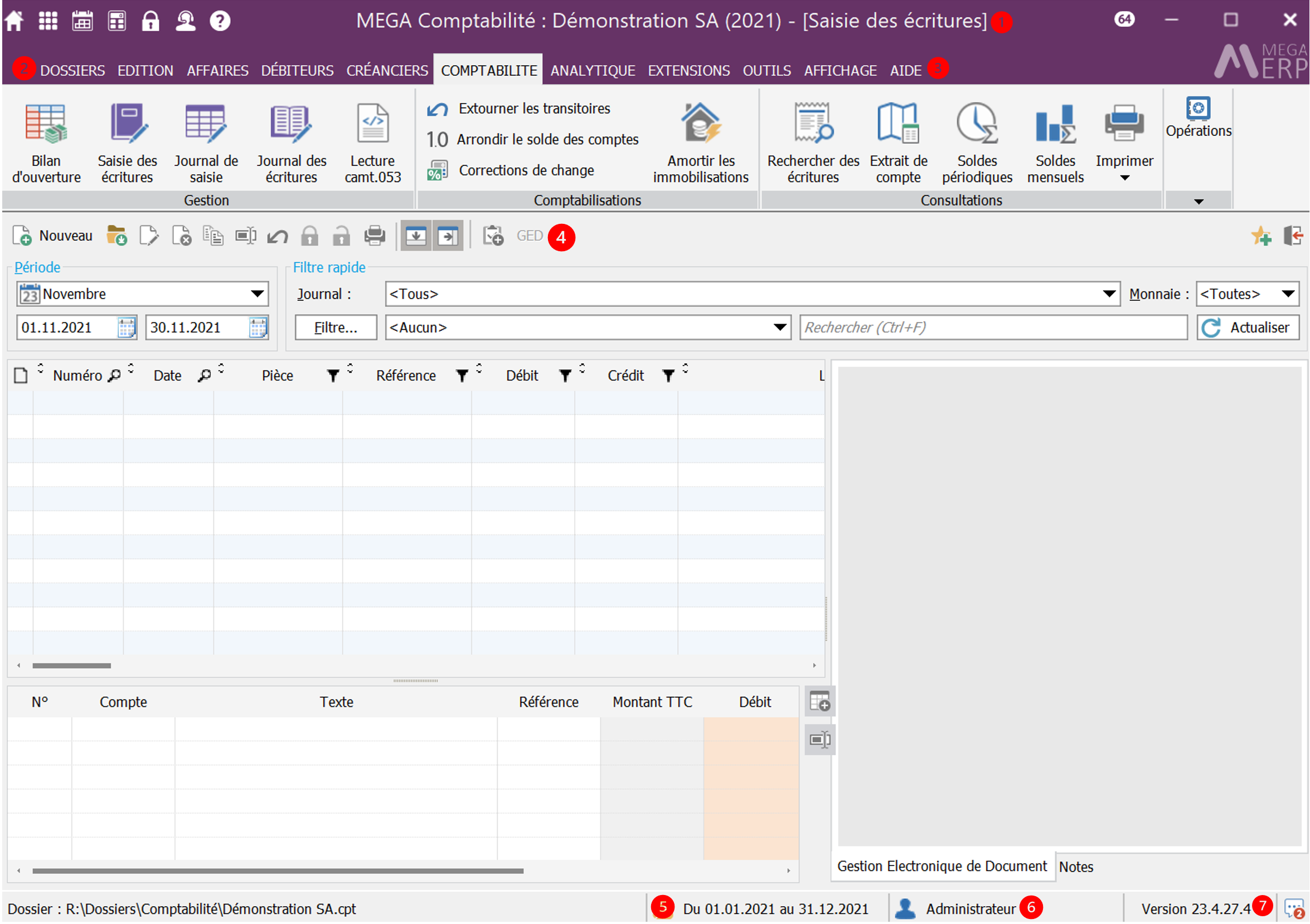 Période de l'exercice comptable en cours. Un clic sur cette information vous permet de gérer les différents exercices comptables.