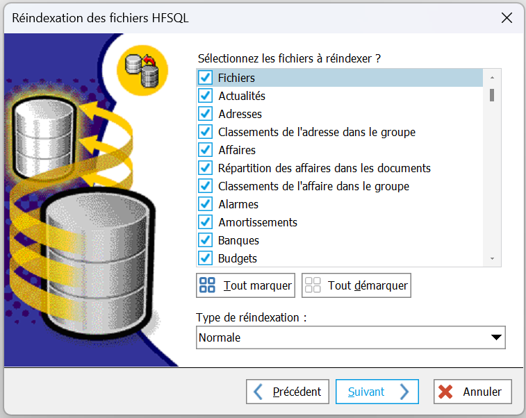 Cet assistant va réindexer les fichiers de données que vous aurez sélectionnés. Si vous ne savez pas quels sont les fichiers endommagés, nous vous conseillons de tous les sélectionner.