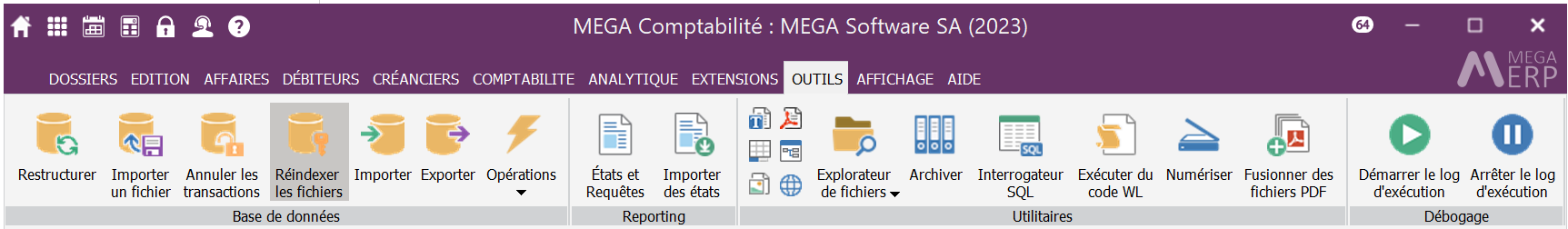1. Sélectionnez l'option OUTILS | Base de données | Réindexer les fichiers dans le ruban.