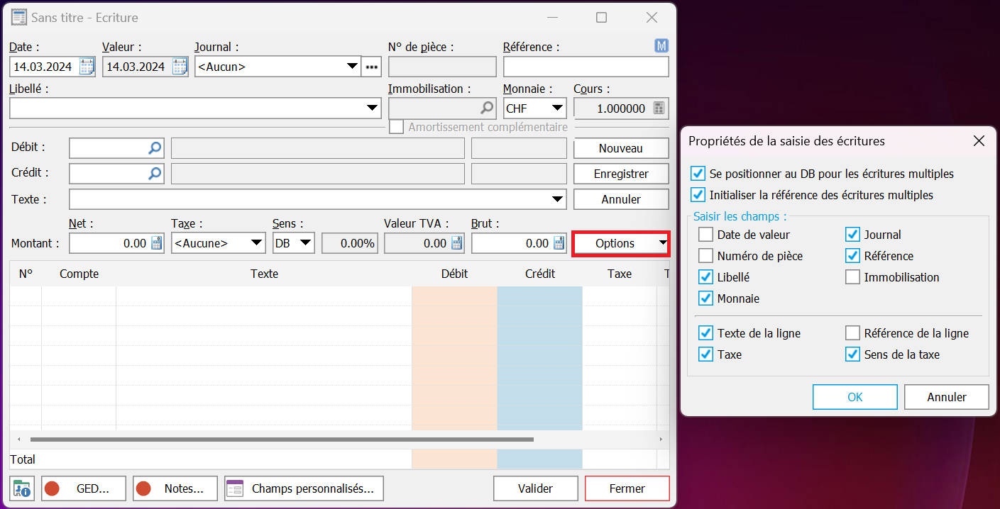 Remarque: Pour saisir plus rapidement, il est possible de paramétrer uniquement les rubriques à remplir. Pour cela, il suffit de cliquer sur Options puis Propriétés de la saisie et cocher les champs qui seront sélectionnés les uns après les autres automatiquement avec la touche Tab du clavier.