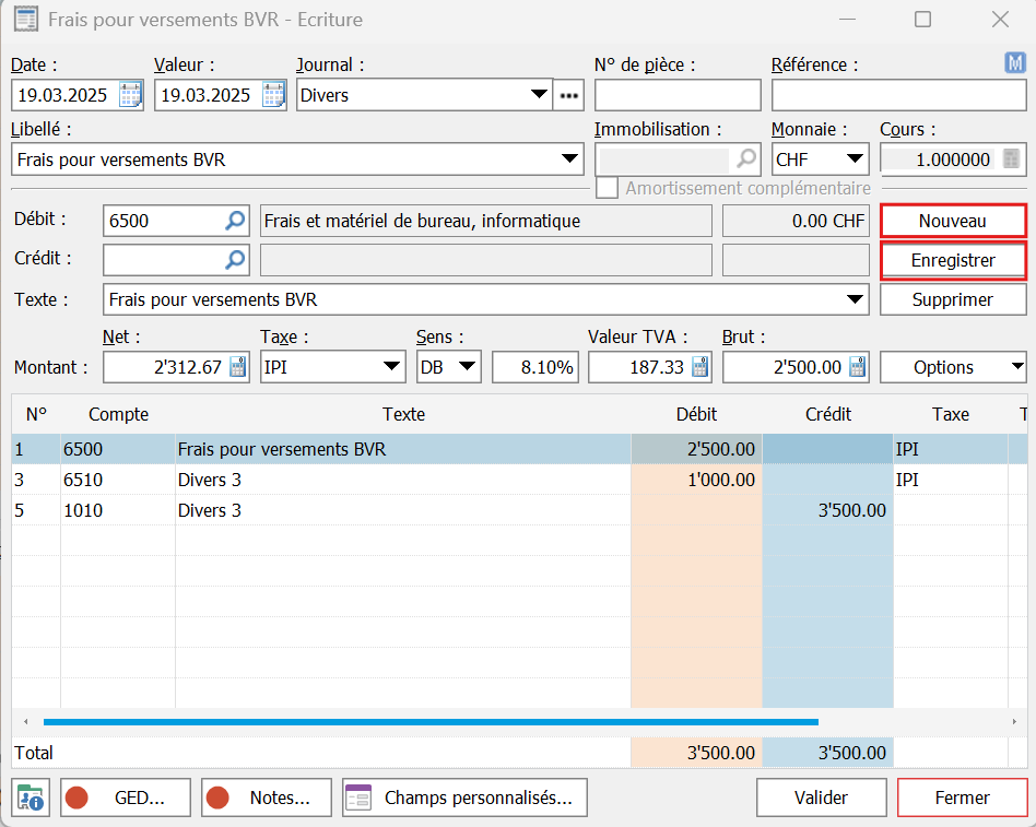 Renseignez les champs: Date, Valeur, Journal, Libellé, Débit, Crédit, Texte et Brut puis cliquer sur Valider.