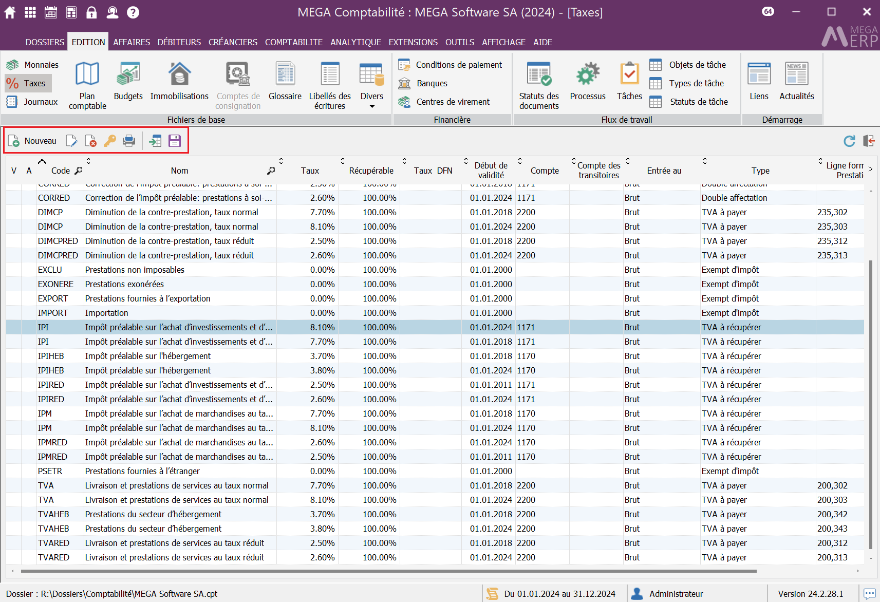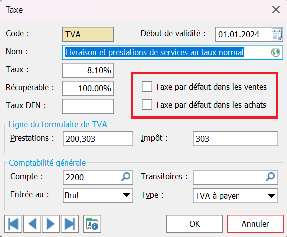 DémarrerMENU EDITIONFichiers de base Taxes Dans le menu EDITION puis l'icône Taxes vous pouvez ajouter, modifier, supprimer une Taxes. Remarque: Vous pouvez choisir une taxe par défaut pour les ventes ou les achats en cochant la case dans la Taxe de votre choix.