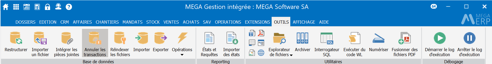 Remarque : La gestion des transactions peut être désactivée lors de la création du dossier ou en modifiant la rubrique GestionTransaction=0 dans la section Connexion du fichier de configuration de la connexion au dossier. Ce fichier se trouve dans le répertoire contenant les dossiers du programme (C:\Dossiers MEGA\Gestion par exemple).