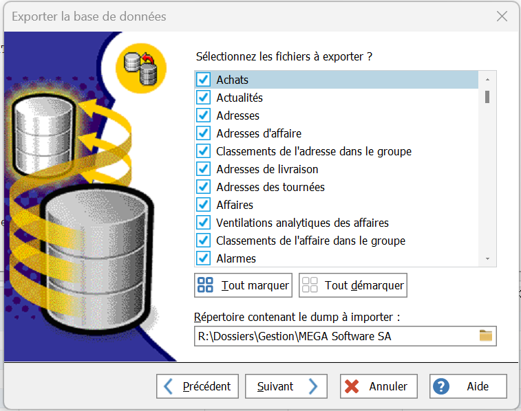 2. L'assistant d'exportation de la base de données s'ouvre. Vous pouvez :