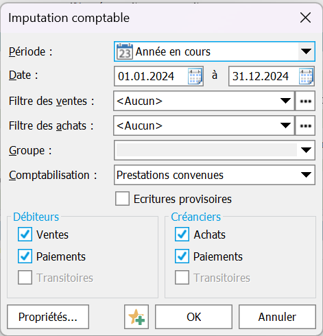 Prestations convenues: toutes les factures achat/vente qu'elles soient acquittées ou non seront imputées dans la comptabilité. Les factures ventes sont dirigées vers un compte débiteur et les factures achat vers un compte créancier.