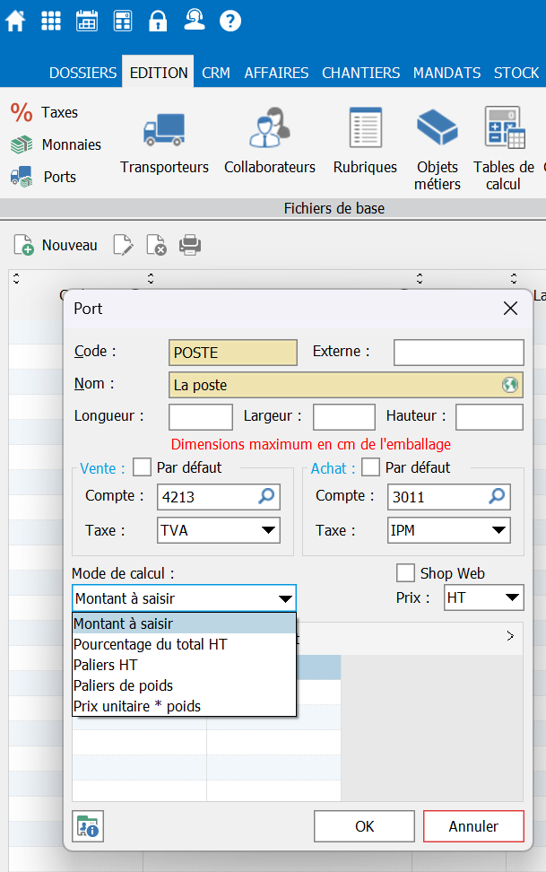 Manuel de l'utilisateurMenu EditionFichiers de base Ports En cliquant sur Nouveau vous pouvez ajouter un port, ci-dessous un exemple. Seuls les champs jaunes sont obligatoires pour un nouvel enregistrement.
