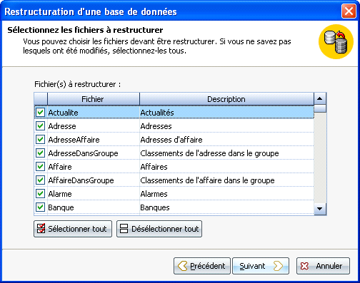 1. Cet assistant est automatiquement affiché à l'ouverture du dossier si la structure de la base de données ne correspond pas à celle utilisée dans le programme.