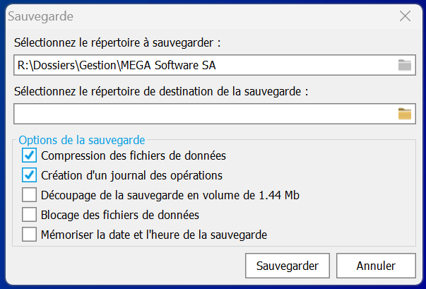 Le programme vous permet de sauvegarder tous les fichiers de données du dossier en cours sur un disque externe. Les fichiers pourront être rechargés à l'aide de l'utilitaire de restauration.