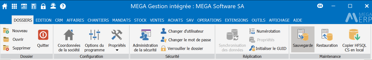 Option du ruban DOSSIERS | Maintenance | Sauvegarde