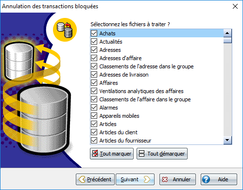 Attention : Si vous travaillez avec une base de données HFSQL Client/Serveur, les transactions en cours doivent être annulées depuis le centre de contrôle HFSQL. Cet utilitaire ne fonctionne que pour des bases de données classiques.
