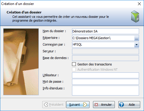 Cliquez sur le bouton Suivant pour compléter les autres informations relatives aux coordonnées de la société et cliquez sur le bouton Terminer pour créer le dossier.