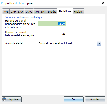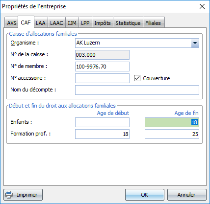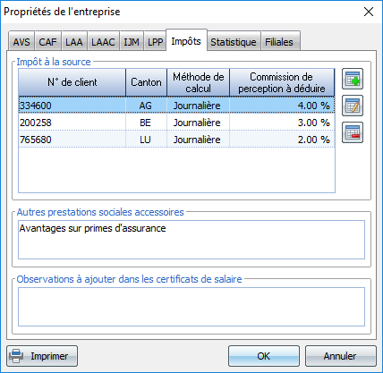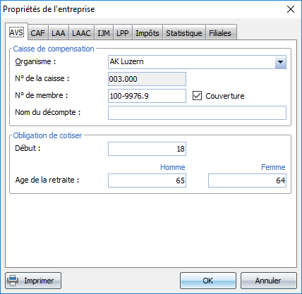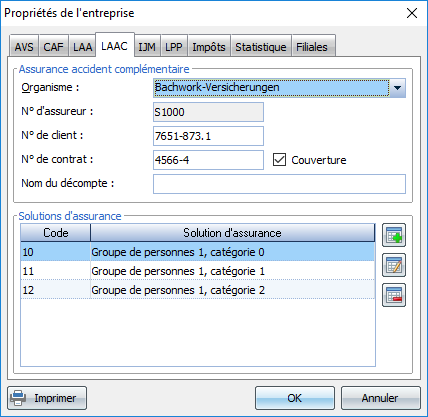 On y traite dans des onglets séparés les données des caisses AVS, caisses d’allocations familiales (CAF), assurance accidents (LAA), assurance accidents complémentaires (LAAC), indemnités journalières maladie (IJM), prévoyance professionnelle (LPP), impôts à la source et statistique.