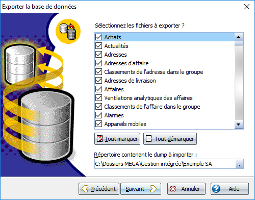 2. L'assistant d'exportation de la base de données s'ouvre. Vous pouvez :