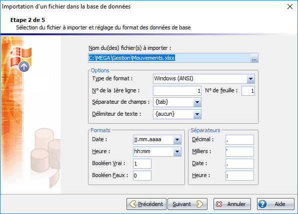 Cet assistant vous permet d'importer dans les fichiers de données de l'application les informations enregistrées dans un fichier texte ou dans un fichier Excel.
