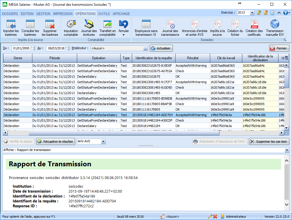 Cette fenêtre contient toutes les transmissions Swissdec effectuées.