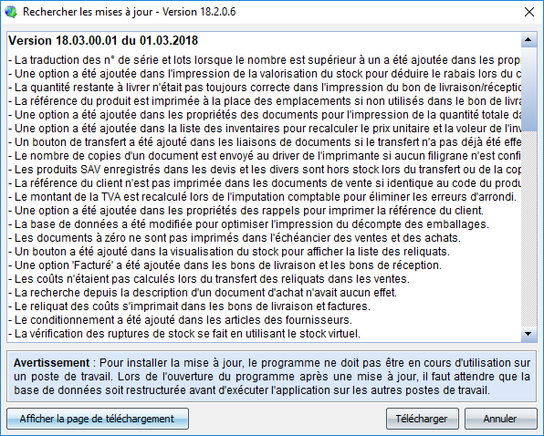 Si une restructuration des données est nécessaire au premier lancement de la nouvelle version, celle-ci peut durer un très long moment et bloquer tous les utilisateurs pendant cette opération. Nous vous conseillons d'installer les mises à jour et de lancer une première fois le programme pendant les heures creuses pour éviter tout blocage.
