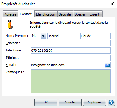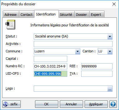Les numéros d’identification liés à l’entreprise sont à saisir dans les coordonnées du dossier :