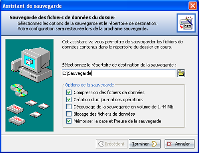 Le bouton Terminer valide les options et lance la sauvegarde de tous les fichiers présents dans le répertoire (et les sous-répertoires) du dossier en cours. Le bouton Annuler ferme l'assistant sans exécuter la sauvegarde.