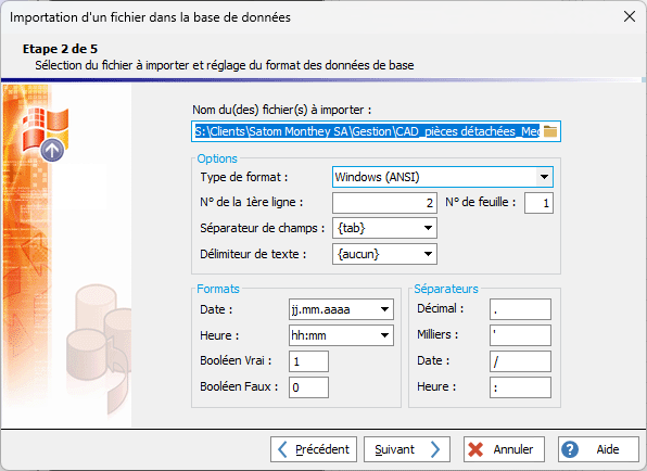 Cet assistant vous permet d'importer dans les fichiers de données de l'application les informations enregistrées dans un fichier texte ou dans un fichier Excel.