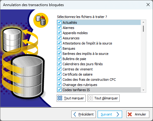 Attention : Si vous travaillez avec une base de données HFSQL Client/Serveur, les transactions en cours doivent être annulées depuis le centre de contrôle HFSQL. Cet utilitaire ne fonctionne que pour des bases de données classiques.