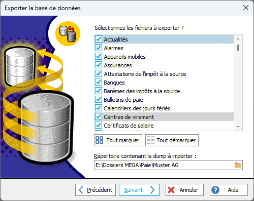 2. L'assistant d'exportation de la base de données s'ouvre. Vous pouvez :