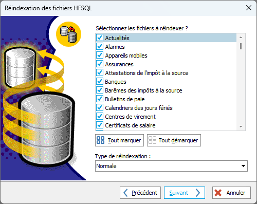 Cet assistant va réindexer les fichiers de données que vous aurez sélectionnés. Si vous ne savez pas quels sont les fichiers endommagés, nous vous conseillons de tous les sélectionner.