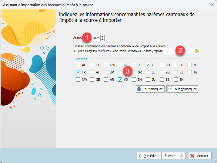 - Sélection des cantons pour lesquels les barèmes doivent être importés.