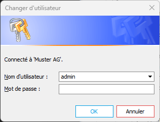Manuel de l'utilisateurDOSSIERS Changer d'utilisateur Option du ruban DOSSIERS | Sécurité | Changer d'utilisateur Cette fenêtre vous permet de changer l'utilisateur de l'application. Les droits d'accès du nouvel utilisateur seront appliqués lors de la validation.