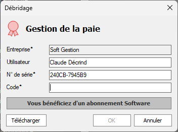 Remarque : Cette fenêtre est également utilisée pour activer des options supplémentaires dans le programme (modules additionnels, nombre d'employés, nombre de dossiers, nombre d'utilisateurs en réseau par exemple). Vous devrez saisir le nouveau code qui vous aura été transmis par notre support technique.