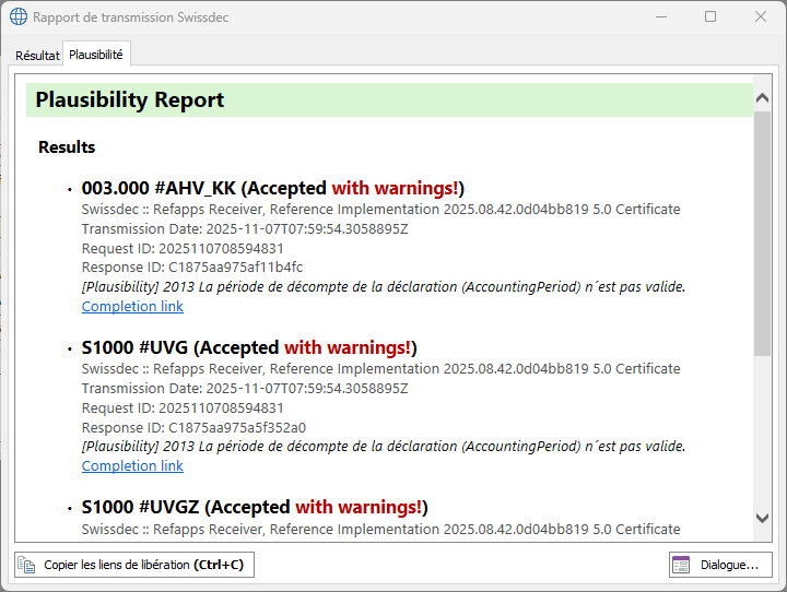 Remarque : Si des opérations sont en traitement, vous pouvez vérifier le status dans le journal des transmissions Swissdec. Si un lien de libération est indiqué, vous devez cliquer sur ce lien qui vous ouvrira le navigateur internet sur la page de l'assureur. Suivez les instructions de l'assurance et validez le formulaire. Cliquez sur le bouton Dialogue si l'assureur vous demande des données supplémentaires à compléter dans un formulaire.