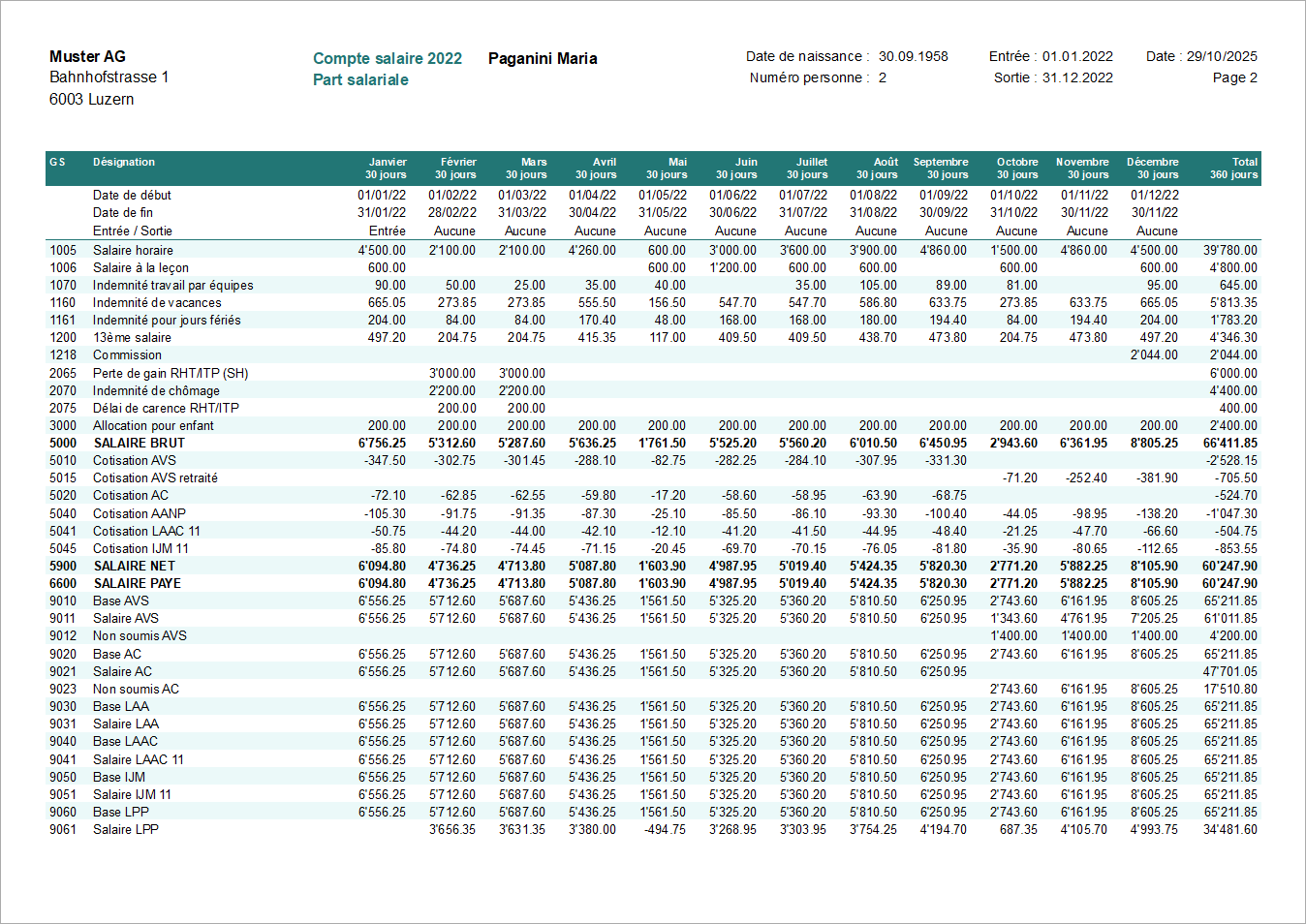 Cette impression vous permet d'imprimer le compte salaire personnel de l'année en cours pour les employés sélectionnés. La récapitulation du total de l'entreprise est automatiquement ajoutée à la fin des comptes personnels.