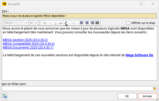 Indique le nom du fichier joint à l'actualité. Un trombone sera affiché dans la liste des actualités et un clic sur le trombone dans la barre d'outils ouvrira le fichier joint à l'aide de l'application utilisée par défaut pour l'extension.