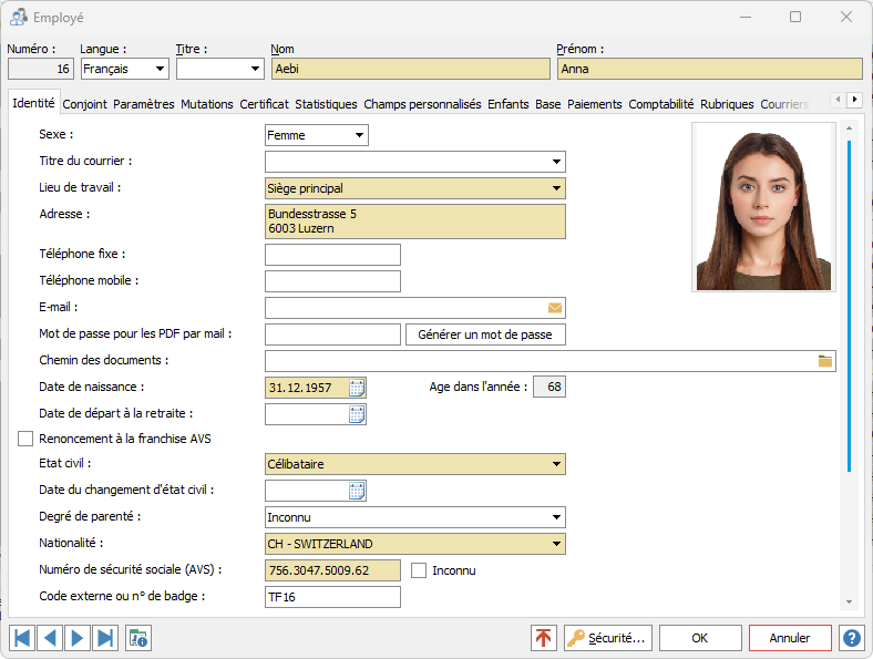 La date de naissance de l'employé est obligatoire. Vous devez vous assurer que cette date est correcte car elle sera utilisée pour soumettre les déductions AVS/AC et pour calculer le départ à la retraite de l'employé. L'age dans l'année est indiqué lorsque une date de naissance est renseignée.