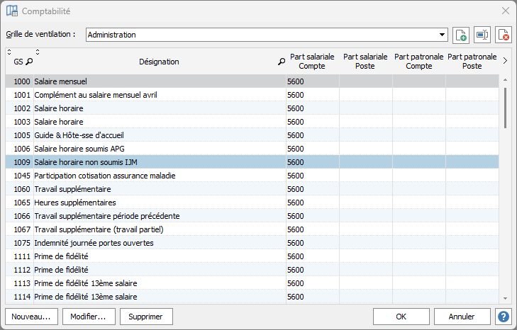 Remarque : Le taux de répartition de la grille peut être paramétré dans la page comptabilité de la fiche employé ou dans le bulletin de paie. L'utilisation d'une grille de ventilation vous permet de diminuer le nombre de rubriques à créer.
