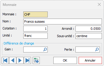 La monnaie CHF est automatiquement créée à l'ouverture d'un dossier si le fichier contenant les monnaies est vide. Vous avez la possibilité d'importer d'autres monnaies à l'aide de l'assistant et vous pouvez enregistrer les cours manuellement ou configurer l'importation automatique des cours du jour ou les cours du mois. Il est également possible de définir la monnaie de référence à utiliser par défaut.