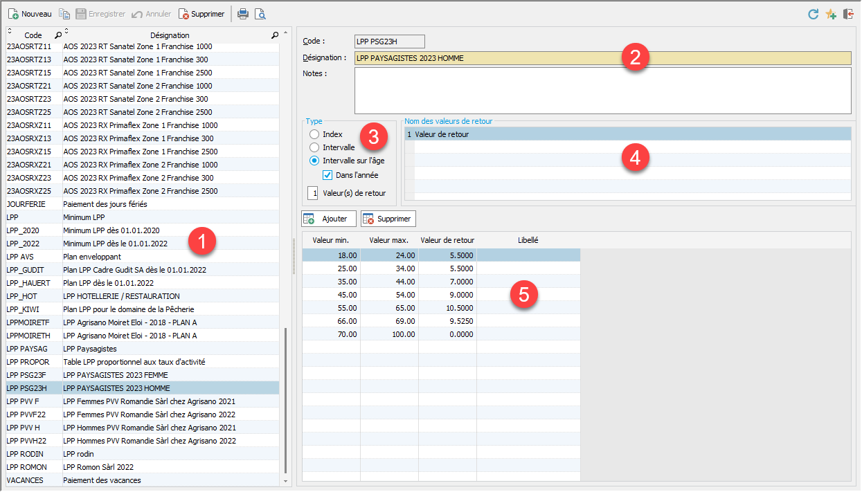 Les tables de calcul vous permettent de définir la valeur de retour selon certaines conditions. Vous pouvez par exemple indiquer le taux de cotisation LPP en fonction de l'age ou de déterminer un taux de commissionnement en fonction du chiffre d'affaire réalisé.
