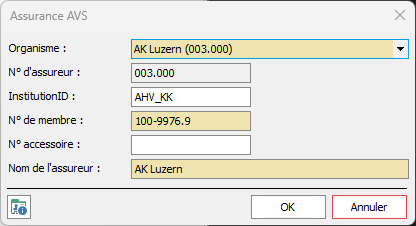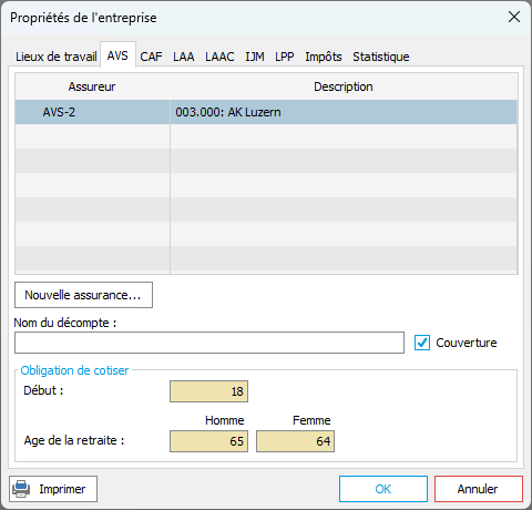 Enregistrement des différents assureurs AVS auprès desquels votre entreprise est affiliée. Vous pouvez également indiquer l'age de début de l'obligation de cotiser AVS/AC ainsi que l'age de la retraite pour les hommes et les femmes.