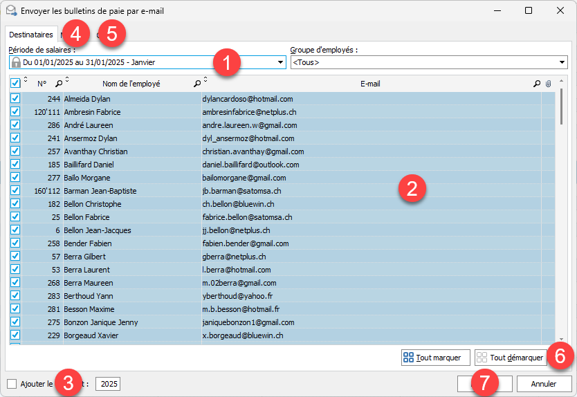 - Sélection des employés. Seuls ceux qui ont une adresse e-mail seront traités.