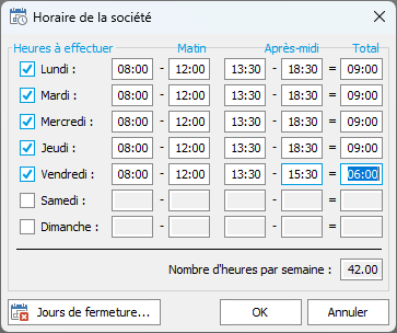Manuel de l'utilisateurDOSSIERSPropriétés Horaire de la société Option du ruban DOSSIERS | Configuration | Propriétés | Horaire de la société Cette fenêtre vous permet d'enregistrer l'horaire de travail de votre entreprise ainsi que les jours de fermeture.