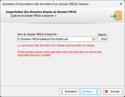 Cet utilitaire vous permet d'importer toutes les données d'un dossier MEGA Salaires depuis une année jusqu'en 2025. Cet assistant peut être exécuté autant de fois que vous le souhaitez et seules les informations relatives à une année seront supprimées avant de lancer l'importation.