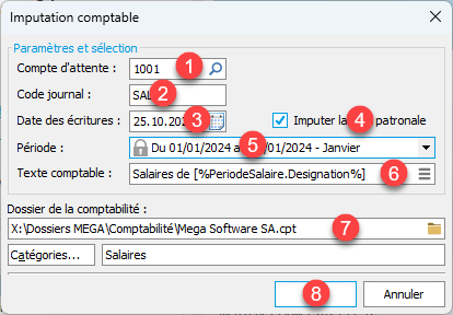 - Nom du dossier utilisé dans MEGA Comptabilité. Si ce dossier est renseigné, les écritures comptables générées seront automatiquement importées dans la comptabilité.