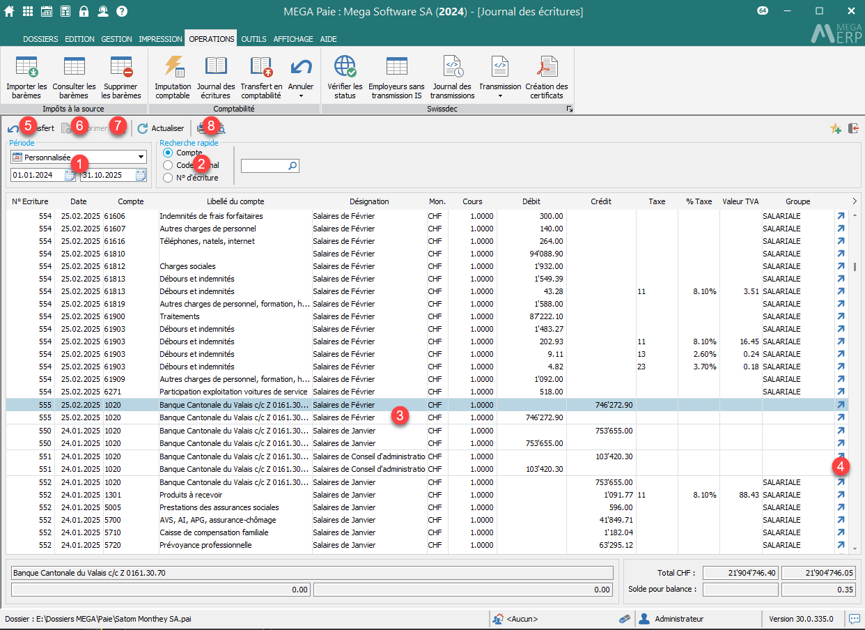 - Liste des écritures selon les critères de sélection.