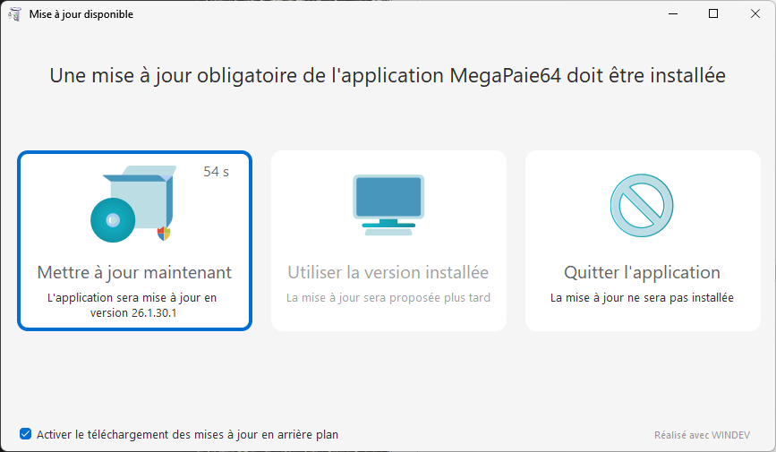 Une mise à jour obligatoire de l'application '<nom de l'application>' est disponible. Pour installer cette mise à jour, fermez puis relancez l'application.